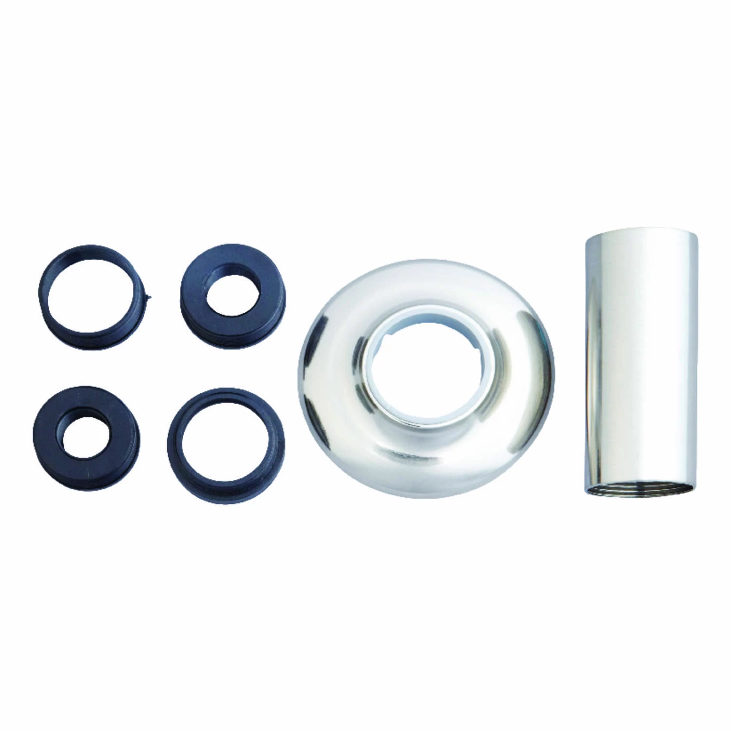 The Ace Universal Tube and Flange Assembly in Brushed Nickel provides a cover for a faucet’s working mechanism, including the stem or cartridge. The assembly comes with adapters for your convenience. The tube and flange has a universal design that fits most faucets and features metal construction. Adapters I.D. widths range from 1-1/2 in. to 3/4 in. Universal design fits with most manufactures Covers the working mechanism of a faucet Stylish brushed nickel matches most existing fixtures Flange – 3 in O.D. x 1-1/4 in. I.D. x 2/3 in. thick; tube – 3 in. length x 1-1/4 in. O.D. Application – tub/shower