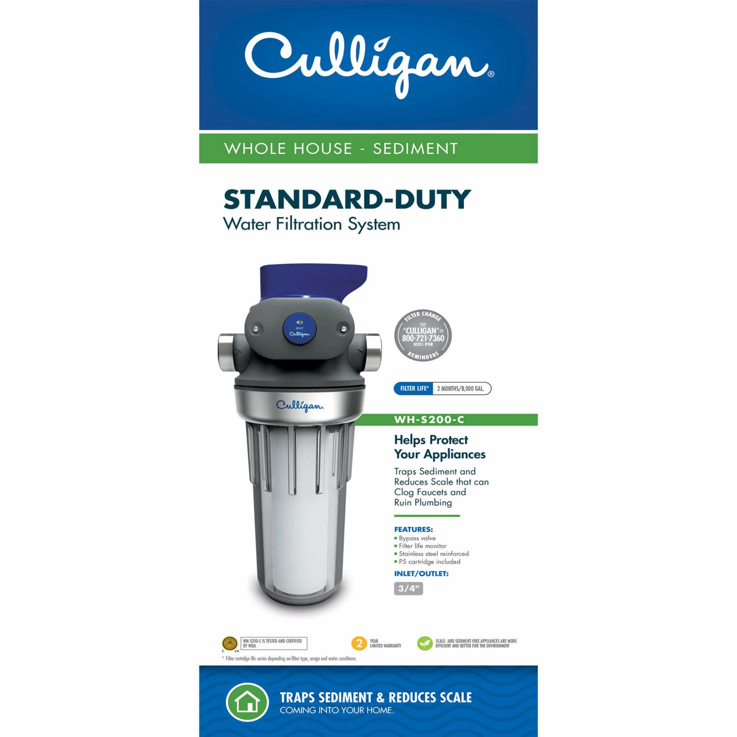 Preserve and protect household plumbing and water-using appliances with the Culligan® WH-S200-C Whole House Standard Duty Valve-in-Head Water Filter System with P5 cartridge. Installs on the 3/4-inch main water line at the point of entry. This filter housing features stainless steel reinforced inlet/outlet and cap for added durability and is designed with a convenient built-in bypass valve to stop the water flow at cartridge change time. A filter life indicator is built into the filter head which alerts you when you need to change your filter cartridge. For ease of cartridge change, a housing wrench is included. Stainless steel reinforced 3/4″ inlet-outlet & sump rim, bypass valve for easy cartridge change, and filter life monitor Filter extends life of washing machines, water heaters, water softeners, fixtures, faucets, and other water-using household appliances Compatible Culligan Filters: CW-MF (Ace #4395976) , S1A (Ace #4396073) , CW-F (Ace #4395968) , SCWH-5 (Ace #4548996) , P1 (Ace #4396057) , P5 (Ace #4396065) WQA/IAMPO Tested and Certified for structual integrity. 2-year limited warranty O-Ring Replacement: OR-150 (Ace# 4867503)