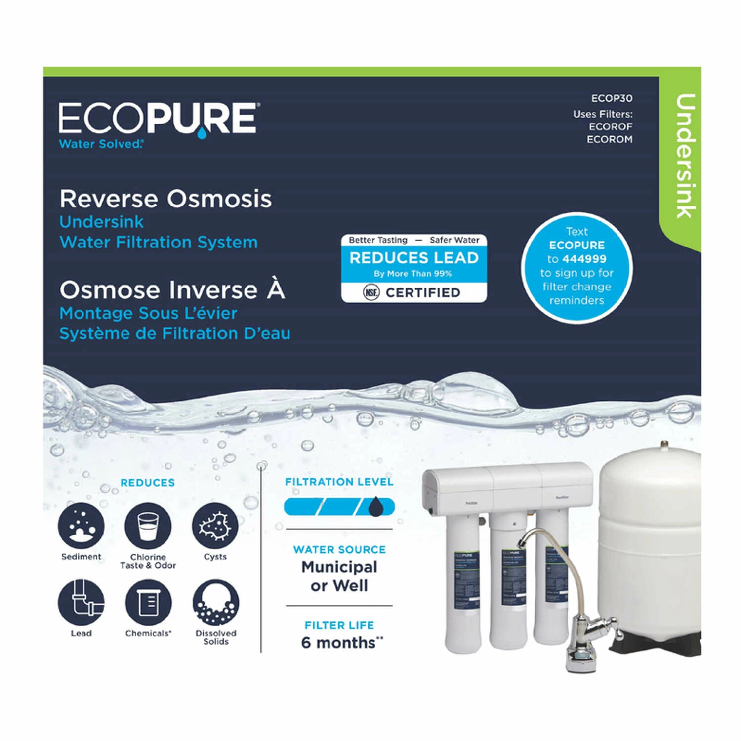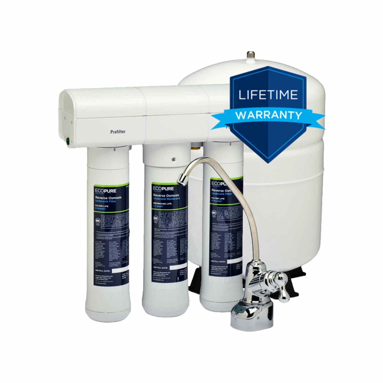 The superior option to bottled water, this 3-stage reverse osmosis system saves you time and money on replacement filters, because when it comes to bottled-quality water, three stages are all you need. Bottled-Quality Drinking Water – Enjoy unlimited access to safe, top-quality drinking water right from your kitchen sink or refrigerator EcoPure reverse osmosis water filtration system comes with convenient color-coded tubing, simplifying the installation process EcoPure provides a convenient, encased filter design allowing for quick filter changes without all the hassle No tools required, no need to shut off your water supply and no touching dirty, contaminated filters Combined with our easy-to-read installation guide and our world-class technical support staff, you’ll be enjoying clean, healthy water in no time Encapsulated filter design means water filter changes are quick and mess-free Replacement filters are ECOROF ACESKU# 4927547 and ECOROM ACE SKU# 4000050