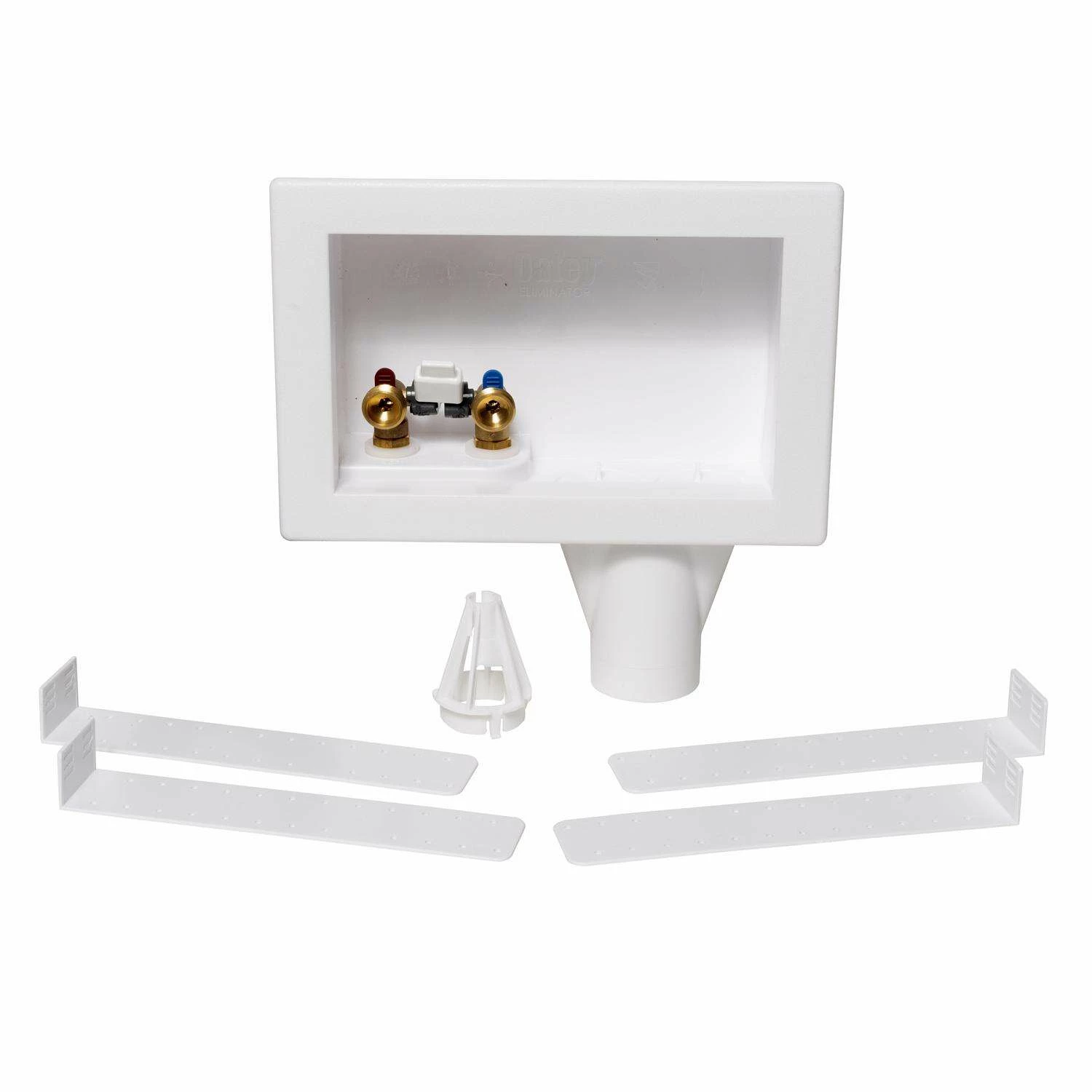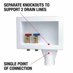 Oatey Eliminator Drain washing machine outlet boxes can be used in commercial or residential applications which require supply valves and waste drain recessed into the wall and an additional drain port is needed. Allows single connection to drain washing machine hose and AC condensate, water softener discharge and/or humidifier lines. Right Outlet Eliminator box allows for drain connection on right, while Left Outlet Eliminator allows for drain connection on the left side of the box. Available water hammer arrestor option provides water pressure shock arrestors required for installation on supply lines to quick closing valves. Allows single connection to drain washing machine hose, AC condensate, water softener, discharge and/or humidifier lines. Engineered clamping system to support discharge lines. 4 support brackets. Install in up to 24 in. stud bay. Single lever brass ball valve, copper sweat – standard pack. Snap-on faceplate frame accommodates up to 1 in. drywall.