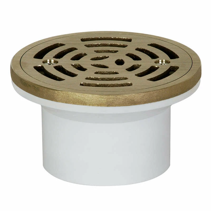 2 x 3 inch PVC general purpose floor drain cast metal ring and strainer satin cast nickel ring and strainer. Machine screws and threaded brass inserts in drain body make strainer replacement fast and easy. Fits over 2 inch Schedule 40 DWV or inside 3 inch Schedule 40 DWV pipe. General purpose floor drain Cast metal ring and strainer Fits over 2 inch and inside 3 inch SCH 40 DWV Machine screws and threaded brass inserts in drain body make strainer replacement fast and easy