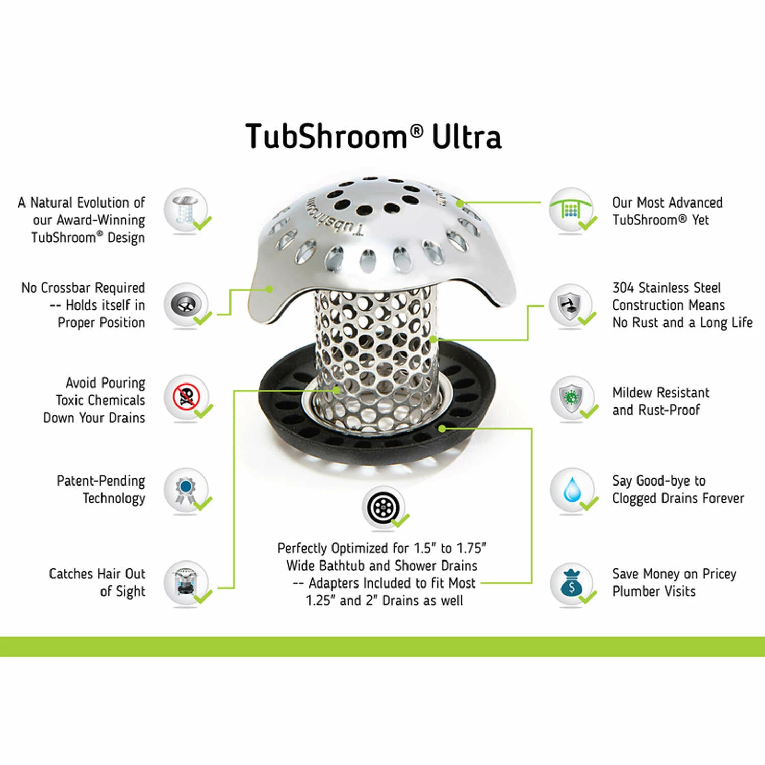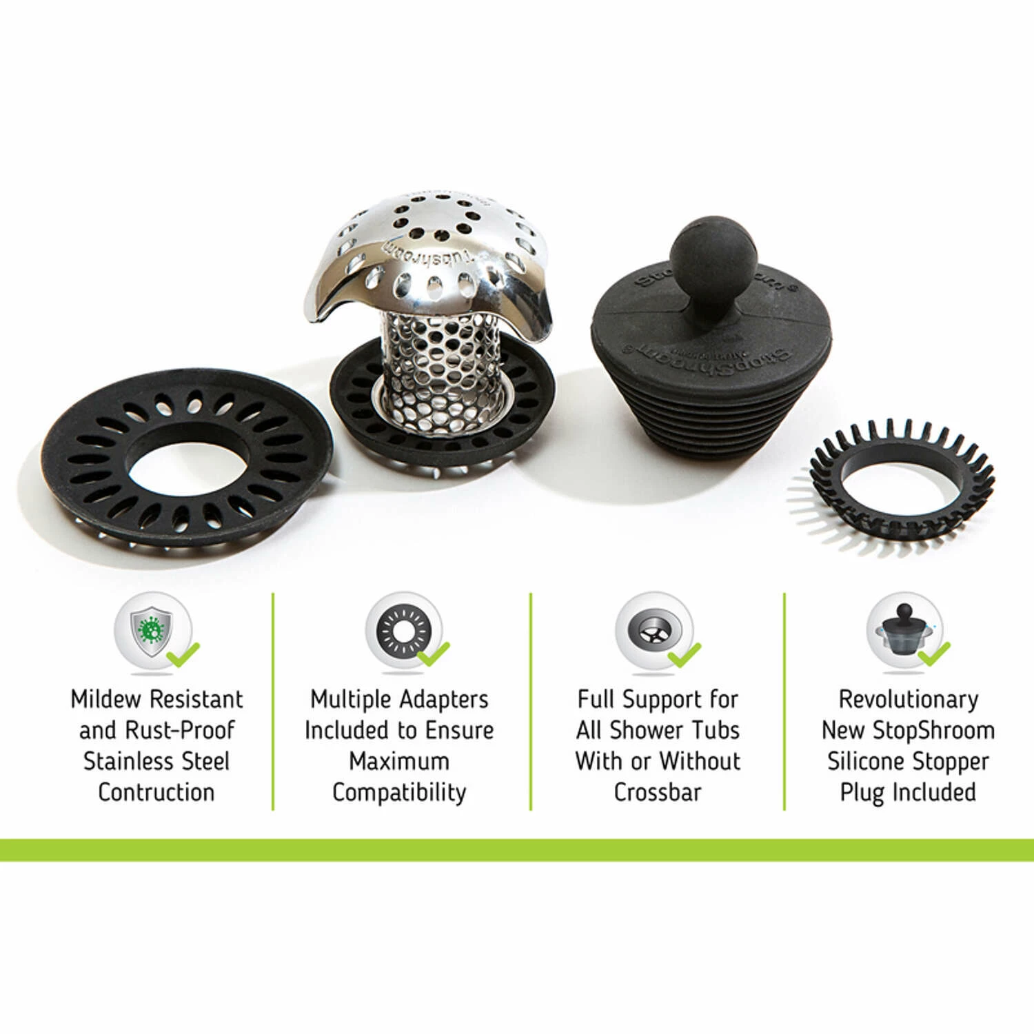 | What's Included | (1) Stainless Steel TubShroom Ultra Plus One (1) 1. 5 in. to 1. 75-in. Adapter, One (1) 1. 25-in Adapter, One (1) 2 in. Adapter, and (1) One All-new StopShroom Plug Universal Drain Stopper |
