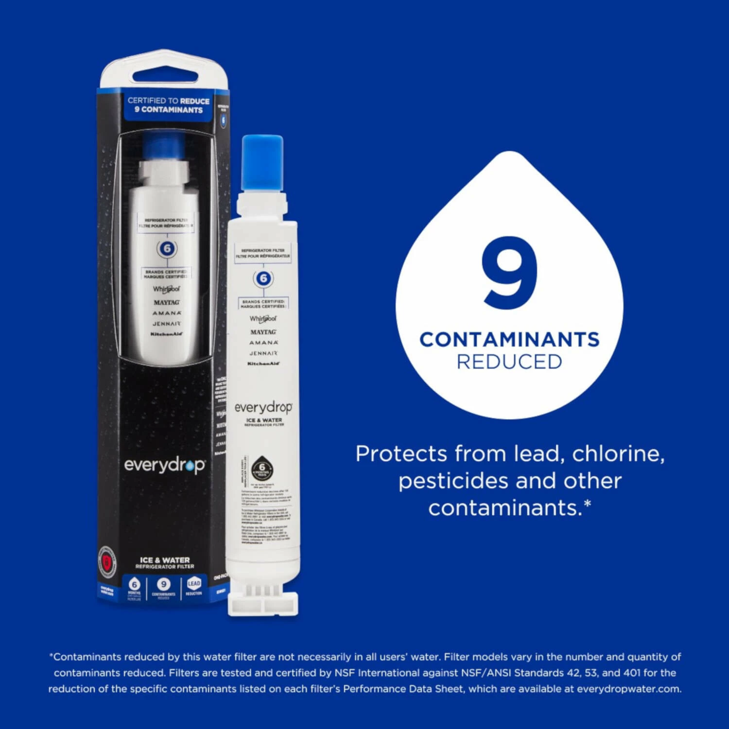 The genuine OEM Whirlpool EDR6D1 EveryDrop Ice & Water Refrigerator Filter 6 refrigerator water filter is a new replacement for the Whirlpool / KitchenAid 4396701 Refrigerator Ice & Water Filter. It is used in top freezer refrigerators for the following brands: Whirlpool, Maytag, KitchenAid, Jenn-Air, and Amana. This product is NSF certified to reduce 9 contaminants including pesticides, metals, industrial chemicals, chlorine taste, odor, and more! Now outfitted in a logical package design with bolder colors and more intuitive model numbers, Whirlpool is committed to getting you the best and correct filter for your refrigerator in the easiest way possible. Refrigerator water filter One Filter The Whirlpool EDR6D1 Filter6 EveryDrop refrigerator water filter is NSF certified to remove 9 contaminants, including: p-Dichlorobenzene, Toxaphene, Benzene, Ethylbenzene, o-Dichlorobenzene, 1,2,4-Trichlorobenzene, Chlorine Particulates, Class I, Lea Filter Life: 6 months or 120 gallons (whichever comes first) Flow Rate: 0.75 gallons per minute Compatible with: 83592 Compatible with: 2301705, 2301706 Compatible with: 6701, 4396701, 4396701P, 4396701T Compatible with: 4396702, 4396703, 4396706
